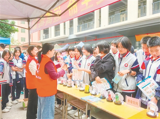 科技节现场精彩纷呈,科普秀、机器人互动、无人机展演等轮番上演,学生们踊跃参与,近距离感受现代科技的魅力。在禁毒宣传专区,整齐陈列的各类仿真毒品模型同样吸引力十足,不少师生驻足观看学习。禁毒志愿者采用“实物+讲解”的方式,通过生动解说与仿真毒品模型展示,系统揭示毒品危害,帮助学生们直观辨识新型毒品的伪装形态,深入学习禁毒法律法规,引导大家强化自我保护意识。最吸引师生们关注的是伪装成日常用品的新型毒品,禁毒志愿者重点聚焦依托咪酯“上头”电子烟,揭露其借时尚外观掩盖神经损害的危害,提醒大家提高警惕,筑牢拒毒防线。