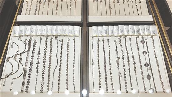 如今,贵金属涨价潮已传导至各级终端市场。在江门利和广场周六福门店内,店员麦小姐忙着接待前来咨询的市民,柜台里龙凤手镯、金戒指等传统饰品旁,新增了铂金吊坠与白银饰品。“最近每天接待的咨询量比上月涨了不少,可能是临近春节,有买婚庆三金的,更有不少市民来问银饰。”她指向柜台中的一部分银手镯,“原来店里进货的银饰种类很少,最近几个月渐渐多了起来。”