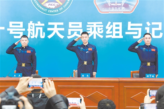 1月16日,航天员陈冬(中)、陈中瑞(右)、王杰(左)敬礼致意。新华社发
