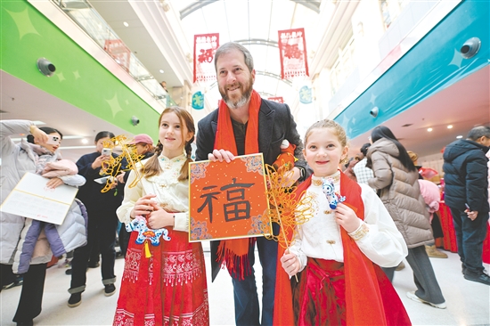 1月24日,天津市第十七届娃娃庙会在天津市少年儿童活动中心热闹开街。本届庙会以“童心共团圆 温暖中国年”为主题,设有非遗手工艺制作、津味非遗美食品鉴、游戏互动等活动,吸引了众多家长和儿童到场体验,感受年味和传统民俗文化的魅力。图为当天,在天津市少年儿童活动中心,外国游客在娃娃庙会上合影留念。