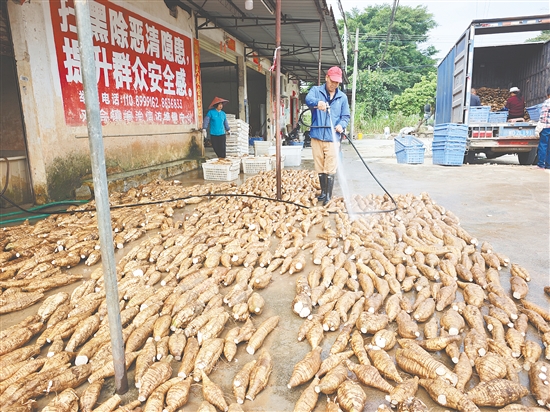 “这几条粉葛还有很多泥,再冲洗一下!”“这一箱粉葛上多余的部分我们都切除好了,交给他冲洗吧……”1月27日,记者走访双合镇先庆村看到,该村村民分工明确,紧密开展“洗葛”作业。“等清洗晾干后就可以打包,这些粉葛将远销加拿大、美国、东南亚等国家和地区。”郑文俊说。