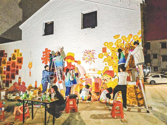 老社区变身新春“艺术画廊”。在蓬江区环市街道里村社区泮海里,原本老旧的墙面悄然换装,以新春元素配上治愈画风为社区添色。这是里村社区党群服务中心联动团江门市委,携手高校“百千万工程”突击队用青春笔触绘就的社区新景。