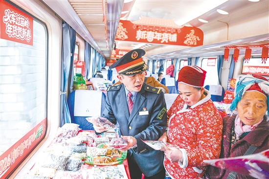 图为2月8日,列车长胡贵川(左)在5640次“慢火车”上向乘客介绍新春年货铺售卖的年货。