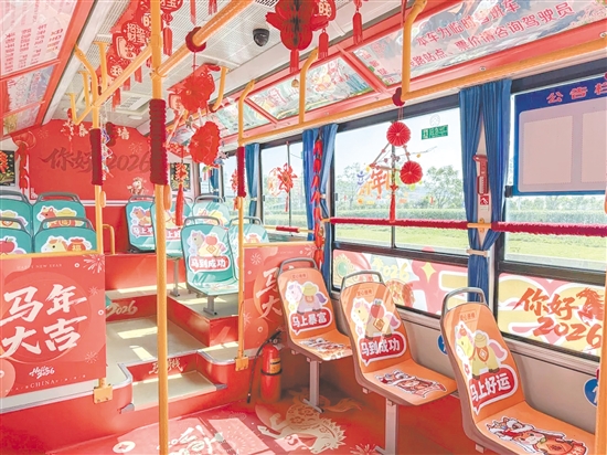乘坐“888路”马年新春免费公交专线,仿佛踏入一片温馨喜庆的梦幻空间。车厢内充满浓浓年味,满眼皆是喜庆的红色,车窗上贴满窗花。最动人的是,新会区会城荘子幼儿园的小朋友们亲手制作了可爱的纸艺骏马、满载心意的中国结,以及寓意年年有余的涂鸦锦鲤等手工品来装饰车厢。这些带着童真与祝福的装饰,让整个车厢暖意融融。