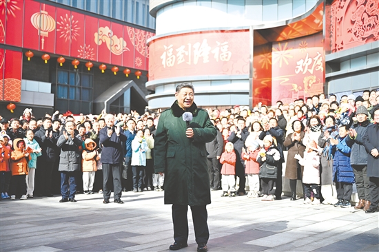 2月9日至10日,中共中央总书记、国家主席、中央军委主席习近平在北京考察并看望慰问基层干部群众。这是10日上午,习近平在东城区隆福寺街区考察时,向全国各族人民和香港同胞、澳门同胞、台湾同胞、海外侨胞致以美好的新春祝福。新华社发