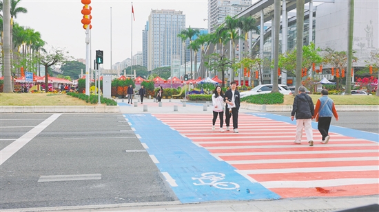 2月13日,五邑华侨广场迎春花市人头攒动,人流络绎不绝。不远处,一条蓝红白相间的人行横道格外显眼。据了解,该人行横道全长33.7米、宽8米,施工期间同步改造人行道面积73.6平方米,迁移路灯1盏,并配套增设交通信号灯、车行道交通标线等相关交通设施,全方位保障市民过街安全。此外,春节过后,人行横道两侧的公交车站将同步进行迁移,进一步优化区域交通布局,提升出行便捷度。