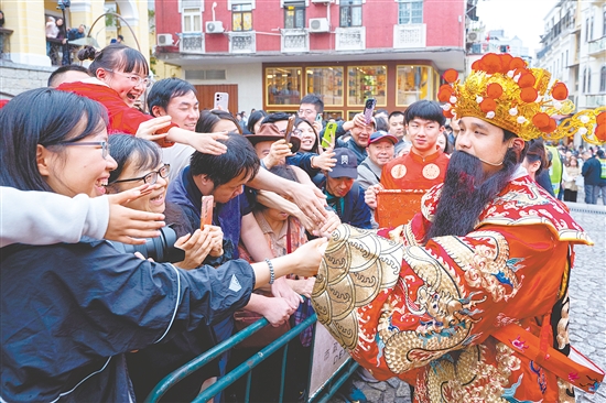 “财神爷”在澳门大三巴牌坊前与市民互动。
