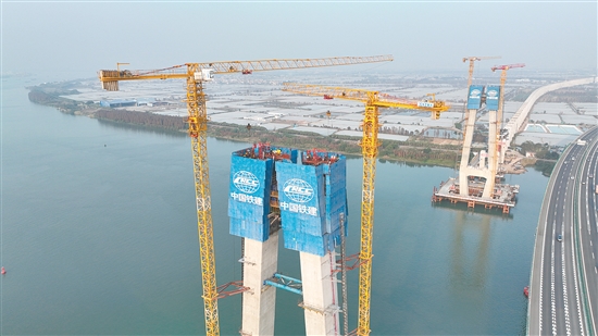 珠江入海口,虎跳门水道波光潋滟、船影穿梭。两岸之间,深江铁路广中江特大桥跨虎跳门水道主桥的两座主塔已双双突破百米,如巨笔蘸云,在粤港澳大湾区书写着新的通途。