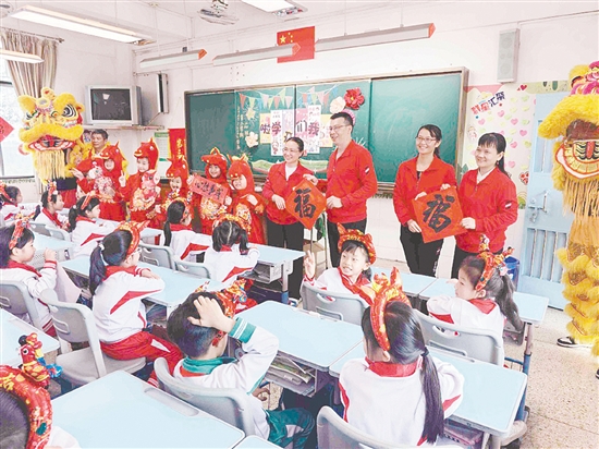 更令孩子们惊喜的是,在开学首日的升旗仪式后,新会圭峰小学党委书记周文斌、校长胡务娟带领醒狮队和“快乐小马”迎新队伍,走进班级,为师生送上别开生面的“快闪祝福”。每到一个班,“快乐小马”便围着教室蹦蹦跳跳,送上新学期祝福,醒狮队紧随其后,在教室内穿梭,与孩子们互动。