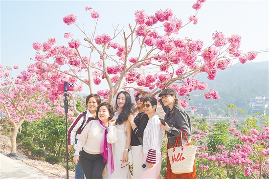 鹤山市共和镇来苏村早前则凭借一片浪漫的紫花风铃木花海成功“出圈”。去年12月末,来苏鸿园景区的紫花风铃木迎来盛花期,漫山遍野的紫色花海如云似雾,吸引了粤港澳大湾区各地游客慕名而来。今年元旦假期日均接待游客超3万人次。