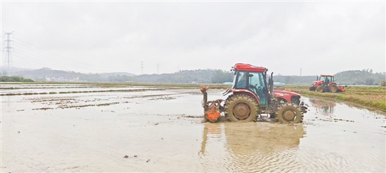 恩平市君堂镇的田野,农机轰鸣,一台台旋耕机在水田中来回穿梭,翻起层层泥浪。农户们卷起裤脚,踩进田中,或查看土情,或调动机器调整田块平整度,一派紧张而有序的农忙场面。“这段时间正是关键期,一刻都不能耽误。”恩平穗丰农业机械装备有限公司负责人张展能说。这段时间,他几乎每天都扎在君堂镇黎塘村,指导员工做好撂荒地复耕工作。