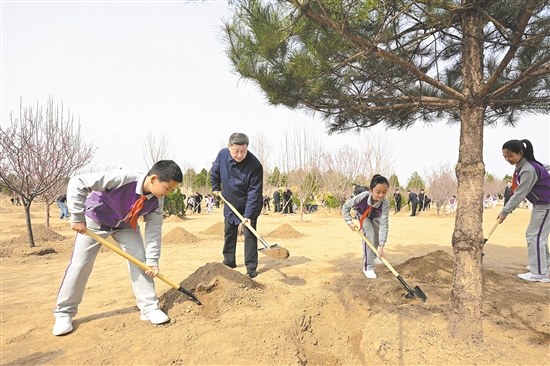 挥锹铲土、培土围堰、提水浇灌……习近平接连种下油松、北京牡丹、榆叶梅、杜仲、元宝枫等多棵树苗。他一边植树,一边询问孩子们的学习生活、劳动锻炼和参加植树情况。习近平强调,青少年像小树苗一样充满活力和希望,要从小树立远大志向,爱知识、爱劳动、爱自然,德智体美劳全面发展,努力成长为栋梁之材。现场气氛热烈,一派繁忙景象。