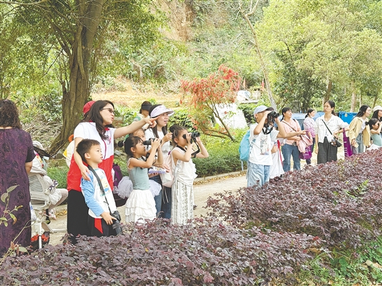 在自然观察环节中,工作人员带领亲子家庭使用望远镜观察、记录野生鸟类,结合保护区周边植物讲解鸟植生态关联,让亲子家庭沉浸式感受生态之美。